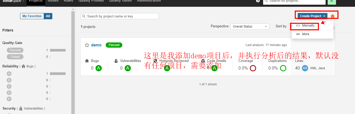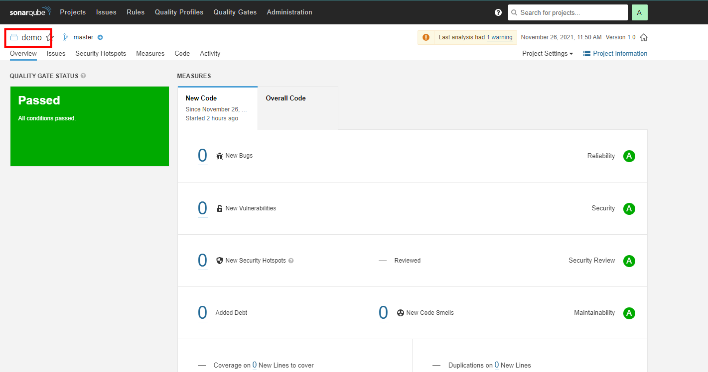 点击图标会跳转到Sonarqube平台,如下图,显示demo任务的具体情况: