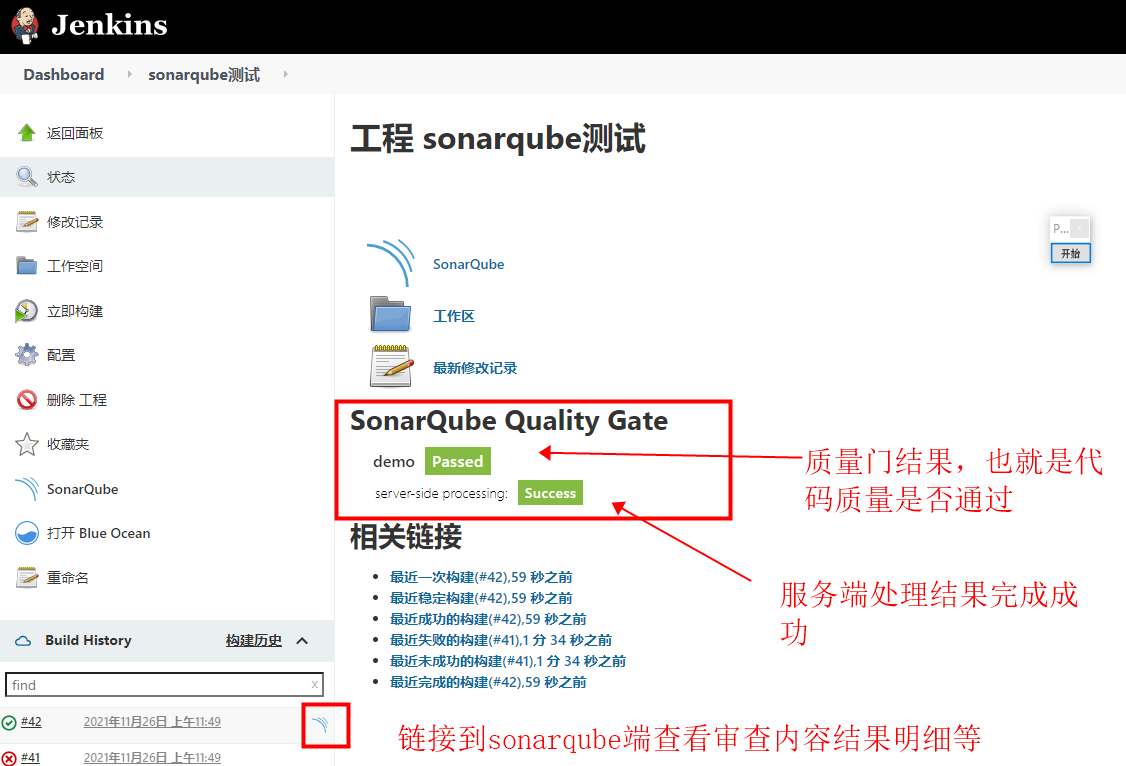 添加完项目后,并且job也配置了sacnner相关参数后,就可以查看构建结果了,构建结束后,job的构建历史会给出结果和连接。