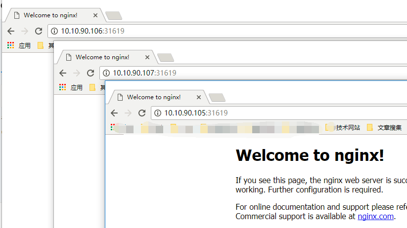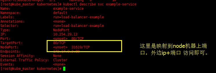 #delete是清理不用的所有pods,service和deployment,非必须执行 kubectl delete pods --all kubectl delete service --all kubectl delete deployment --all 这里以下是测试一个nginx集群部署的 1、定义集群并启动 kubectl run nginx --replicas=3 --labels="run=load-balancer-example" --image=nginx --port=80 2、定义集群服务 kubectl expose deployment nginx --type=NodePort --name=example-service 3、查看服务信息 kubectl describe svc example-service