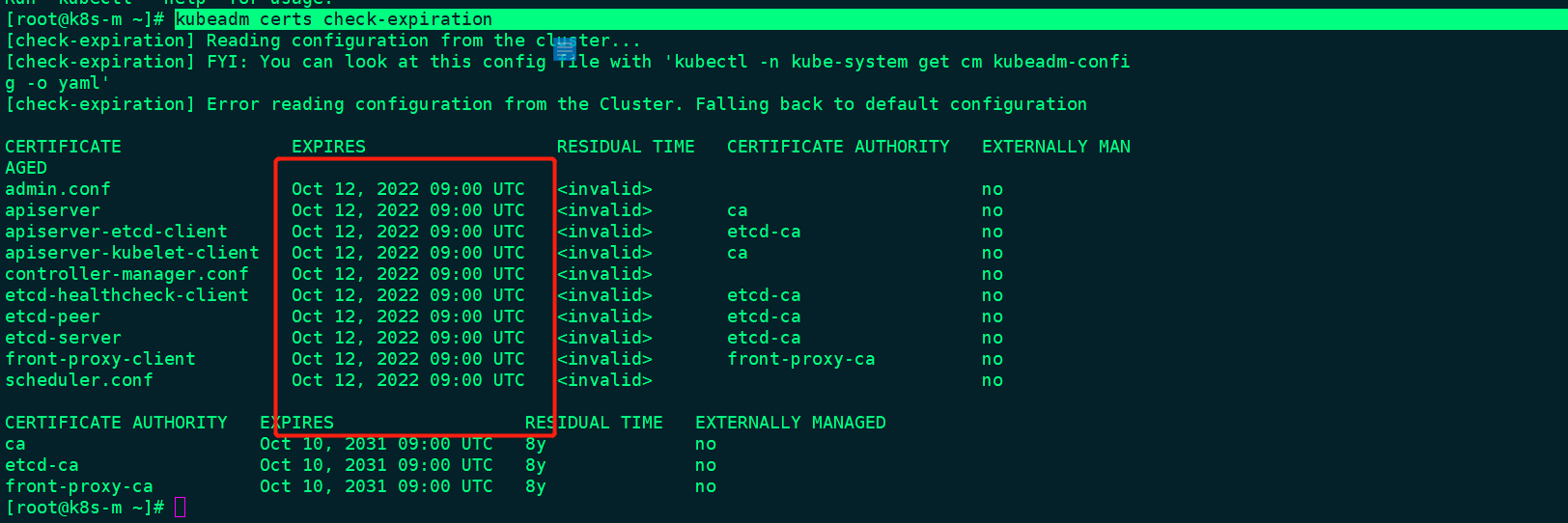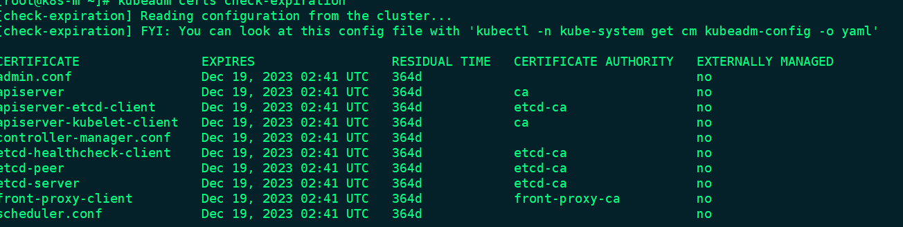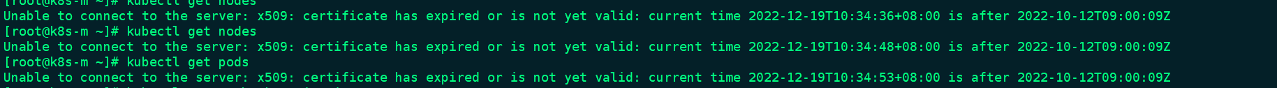 通过提示确实是过期了,那么我们来使用集群证书命令确认以下:执行