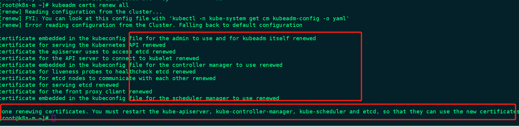 第一步: 手动更新证书,执行:kubeadm certs renew all