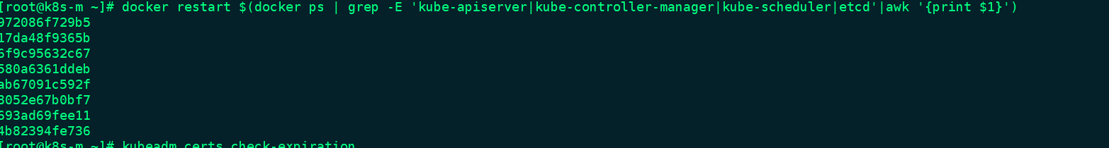 docker restart $(docker ps | grep -E 'kube-apiserver|kube-controller-manager|kube-scheduler|etcd'|awk '{print $1}')