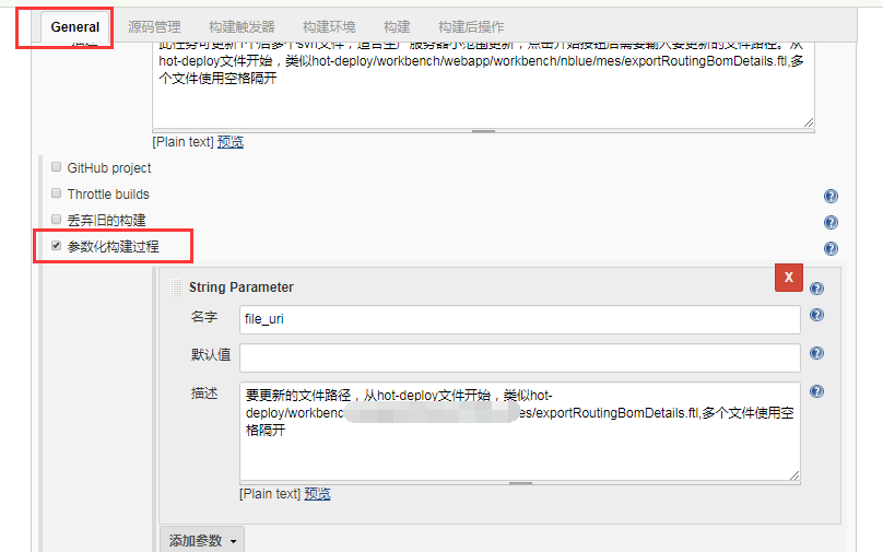可以简单描述你要改参数的作用。此处定义过参数之后,在后面的【构建】环境中就可以调用该参数了,而且该参数是需要