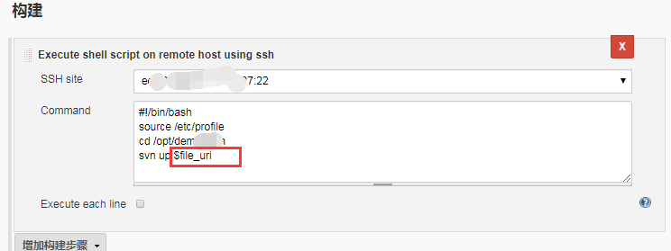 如图,我再【构建】环境使用了另个远程执行shell命令的插件去执行shell 脚本,在脚本中