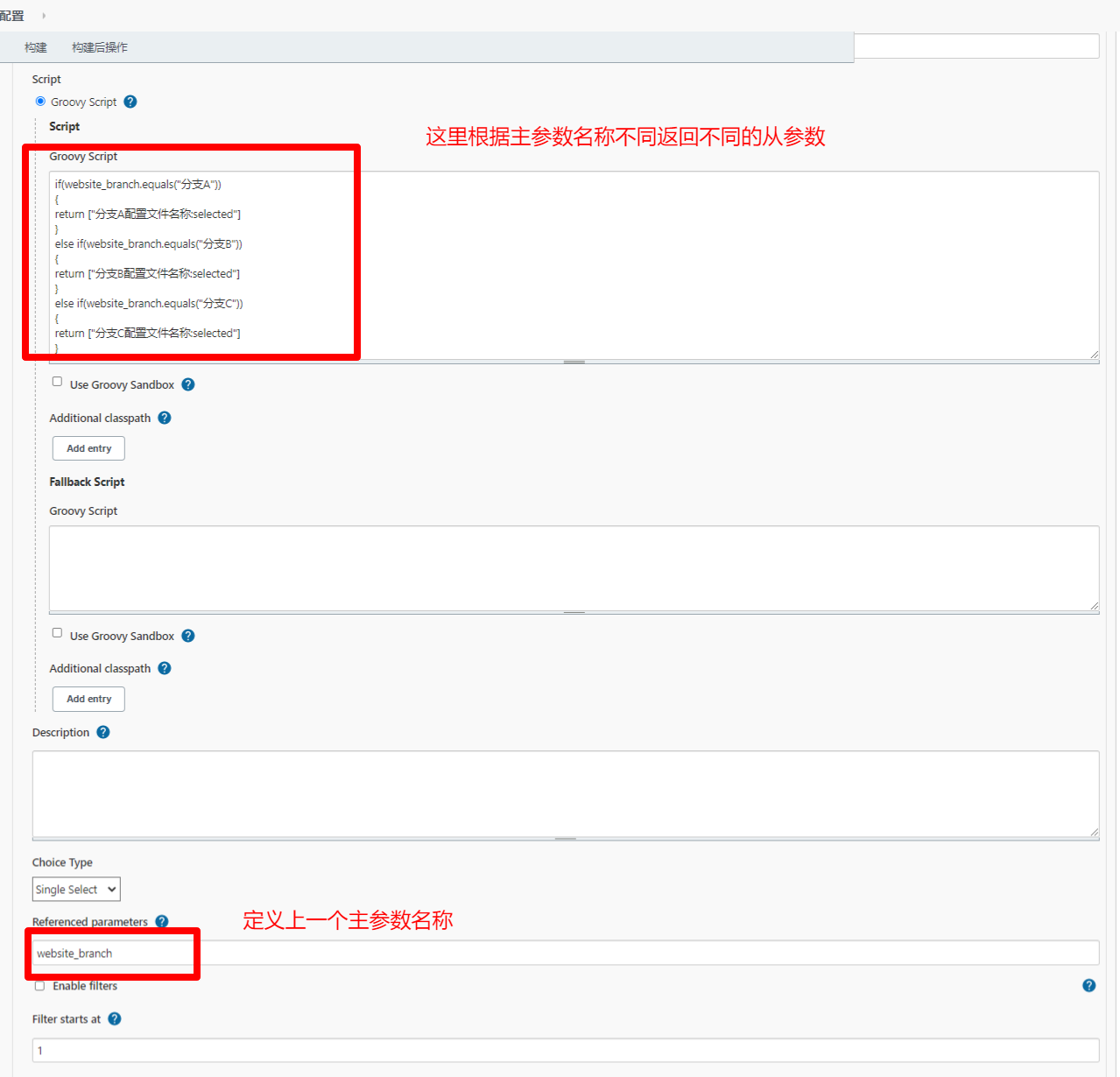 这样就可以实现主参数website_branch选择分支A,profile返回A对应的配置文件名称,以此类推