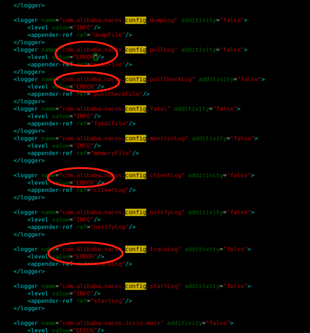2、其他三个在nacos-logback.xml中修改日志级别,或根须需求调整为WARN