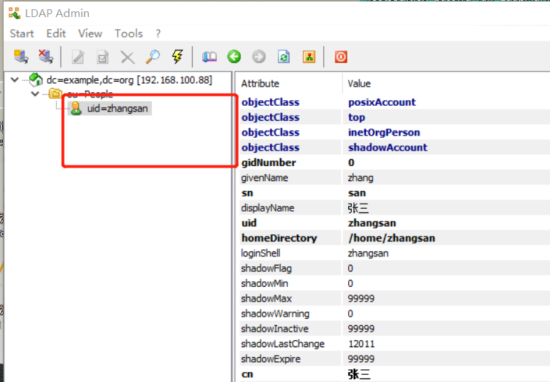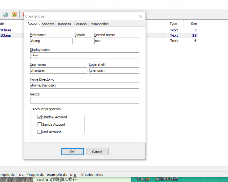 可以看到左侧已经出现ou=People,我们可以在这里开始新建用户,选中People,右键New--User,如下,建立一个用户名为zhangsan,展示名为张三的用户,点击ok,左侧即可看到创建后的zhangsan