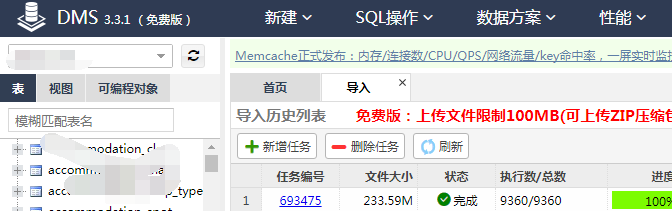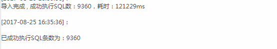 结论:文件限制一百兆,幸好支持压缩文件。导入233M数据耗时121229,也就是121秒,貌似还可以。但是
