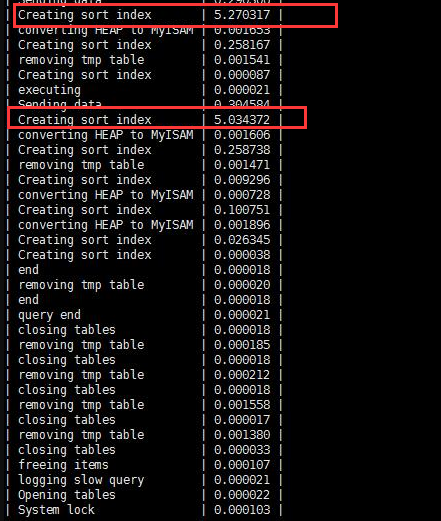 那就是show profile中 有2个步骤耗时5秒,合起来占用了11秒,步骤名称为:Creating sort index