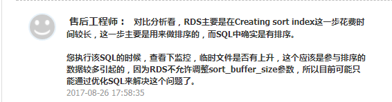 是8月26日,为了追求这个Creating sort index到底为啥会这么高,我就继续追问了下去,ok